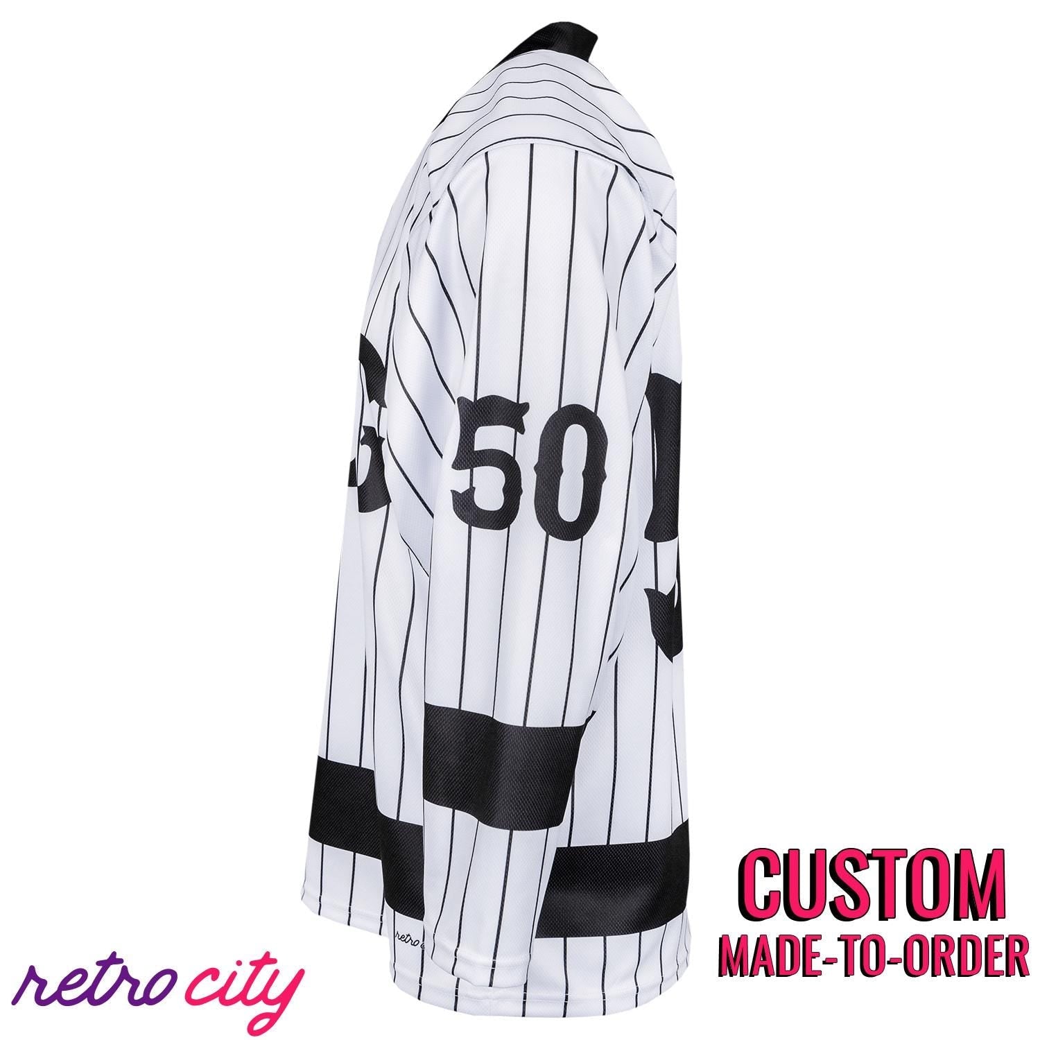 This custom lace-up hockey jersey features a white base with black pinstripes and black text.