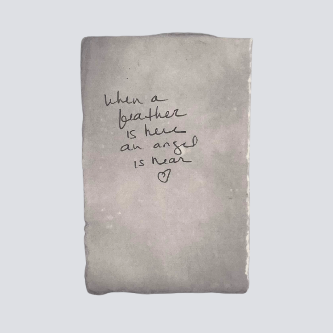 Each Large Angel Feather is a hand-painted, one-of-a-kind piece created by Sunny on deckle-edged handmade paper. Measuring approximately 4 x 6 inches, these feathers offer a striking presence and are especially suited for framing, gifting, or displaying in sacred or comforting spaces.